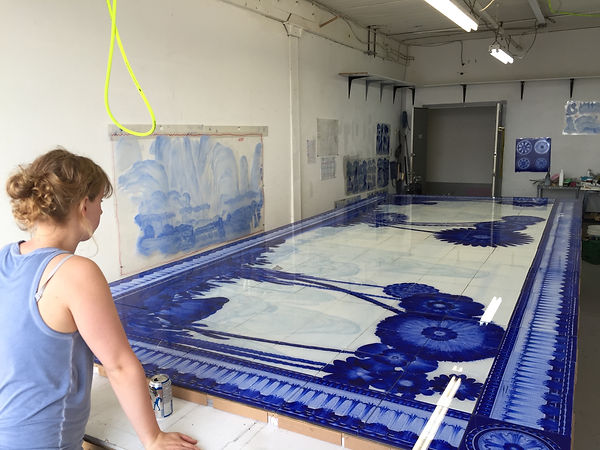 It consists of 2 murals, each 2.3m x 5m. A size as oil on mylar painting was made then cut into squares and sandwiched between 2 pieces of glass. These glass tiles were then mounted on panels and installed on the wall.